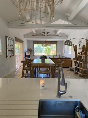 Un séjour lumineux et spacieux avec vue sur le jardin et la piscine, cuisine américaine équipée, 1 suite et 2 chambres climatisées, toutes équipées de salle de bains et dressings tout cela avec une belle hauteur sous plafond.
