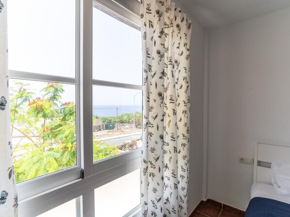 La chambre principale dispose d'un lit double, d'une grande armoire et offre une vue sur la mer.