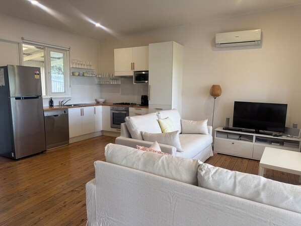 Cette charmante maison de plage peut accueillir jusqu'à sept personnes avec ses trois chambres (une avec un lit queen, la seconde avec un lit simple superposé double et la troisième avec un lit simple superposé). Profitez de la vue magnifique et détendez-vous sur la nouvelle terrasse spacieuse tout en dégustant un verre de vin McLaren Vale tout en regardant les enfants jouer sur l'herbe.