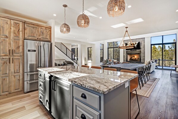 Back inside, you and your guests will delight in the 'Top Chef' kitchen, which includes a large granite island, professional state-of-the-art appliances, a wine fridge, two sinks, and two dishwashers. The open kitchen and dining rooms provide ample room for gathering - seating for 12 at the large dining table and four more at the island countertop. This mountain chalet with a professionally designed interior includes top-of-the-line furnishings throughout. The main living area features comfy sofas, a beautiful stone wood-burning fireplace, and a large 4K smart TV, creating the perfect place to watch the big game (or ski report) while you soak in the stellar mountain views.