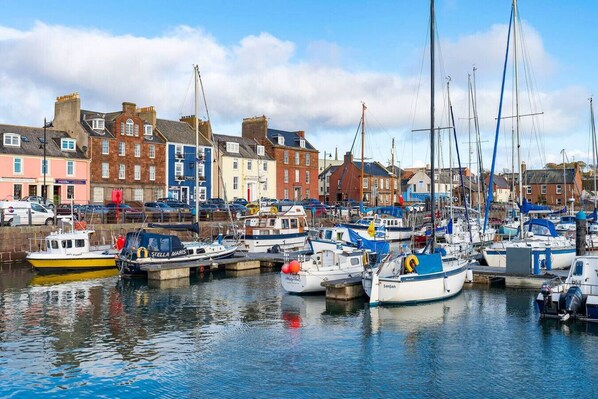 Pretty picture-postcard views are in abundance at this fabulous property on Arbroath’s historic harbour front. Part of the old fishing port’s heritage trail, the house at 1 Shore has been beautifully furnished with thoughtful touches like ropework lamps and themed artworks, which remind you of your charming coastal setting. Guests love the space and comfort, plus there’s plenty to see and do in Arbroath, which is famous for its ‘smokies’, as well as further afield in the lovely Angus region.This fully renovated and spacious property occupies two floors of this historic building which is situated on the harbour front. There are four bedrooms in total (two double bedrooms upstairs and two king bedrooms on the ground level), plus two bathrooms, two kitchens and two lounge areas making it ideal for larger families, corporate or tour groups. Key Features Fabulous location on Arbroath harbour4 double bedrooms (2 are king sized)2 kitchens, 2 bathrooms and 2 lounge areasOn street parking available LocationArbroath, on Scotland’s east coast is known for its historic Abbey and its role as the signing place of the Declaration of Arbroath in 1320. The present harbour, now developed as a marina, dates from 1877 and the town’s heritage trail takes in many of the local characterful buildings, with tales of pirates, shipmasters and smuggling!Just minutes from 1 Shore are excellent local fresh fish shops and restaurants as well as gift shops and art galleries. Further afield take a trip to the golden, sandy beaches at Lunan Bay or the spectacular coastal nature reserve at St Cyrus. The stunning red sandstone cliffs at Auchmithie are also worth seeing and you can even take a boat trip to the Bell Rock lighthouse, built by Robert Stevenson.There are several golf courses within easy reach such as the famous links at Carnoustie and many other sports opportunities including sea-kayaking and sailing.Public transport links are good with the main bus and rail stations less than a mile from the property with easy connections to all the major Scottish cities. There is a good road network too connecting Arbroath with Aberdeen to the north and Dundee to the South. Welcome to 1 Shore and have a fantastic stay!