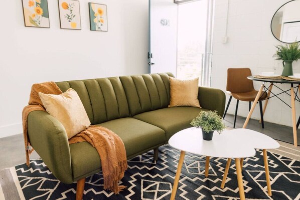 Enjoy a boutique hotel experience in a studio apartment located in a beautifully restored 1964 building, fully remodeled in 2020. Each unit features similar but unique decor, with the same layout and amenities for a consistent stay.