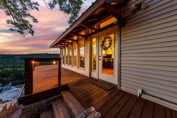 Wraparound deck and back patio equipped with string lights for a fun and charming experience while you listen to your favorite record playing in the background.