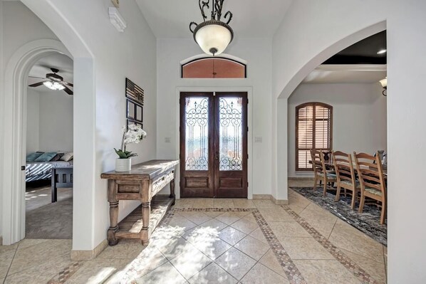 Added perks at this 3000 square-foot estate include a shuffleboard, a corn hole, darts, a grill, and alfresco dining.