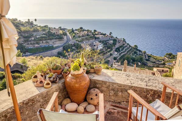 Dans le village pittoresque de Banyalbufar, à la périphérie des montagnes de Tramuntana, se trouve la charmante Casa Can Sans, qui offre une vue spectaculaire sur la mer et la côte. Distribuée sur deux étages, la maison de vacances de style rustique dispose d'un salon et d'une cuisine bien équipée au rez-de-chaussée ainsi que de 3 chambres et d'une salle de bains au premier étage et peut accueillir un total de 6 personnes. Elle comprend également une connexion Wi-Fi, des ventilateurs et une cheminée. La terrasse au rez-de-chaussée avec des sièges et un parasol ainsi que le balcon avec une vue sur la mer fantastique procurent une parfaite sensation de bien-être. Vous pourrez y terminer une journée parfaite en dégustant un verre de vin et en regardant le coucher du soleil. Située dans la partie la plus élevée de la ville, la maison de vacances est un havre de tranquillité et vous invite à passer des vacances vraiment relaxantes. À Banyalbufar, vous trouverez une boulangerie et un petit supermarché, mais l'offre est limitée. Le village d'Esporles, avec un plus grand choix de supermarchés et de restaurants, est accessible en un peu moins de 20 minutes en voiture. La baie de Cala Banyalbufar, avec sa plage de galets, se trouve à 800 m et est accessible en 10 à 15 minutes à pied. Les plages de sable se trouvent à Palma ou à Port de Sóller, à 30-35 km (45-50 minutes en voiture).