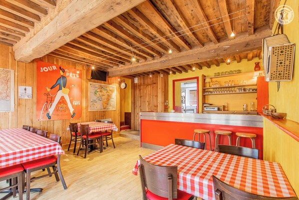 Musiciens professionnels ayant tenu le café-concert qui occupait autrefois les lieux (possibilité de concert privés durant votre séjour), Eddy & Estelle vous accueillent dans un authentique ancien bistrot de village ayant conservé son charme d'antan, niché au sein d'une ravissante maison de bourg du XIXe intégralement restaurée. En plein cœur d'un pittoresque petit village typique du haut charolais, adossé à flanc de colline & lisière de forêt sur un coteau ouest bien exposé. "Haut lieu de la résistance" durant la seconde guerre mondiale, doté entre autres d'un citystade pour les enfants (sis à deux pas) & d'un bucolique étang de pêche de 15 ha très réputé, Beaubery dispose d'un sublime écrin champêtre & naturel préservé de montagne douce, succession d'apaisants vallons bocagers de pâtures & prairies dominées par les collines boisées des monts environnants. Superbes paysages & belvédères panoramiques à découvrir aux alentours. Gîte très spacieux. Chaleureux cachet campagnard mixant l'insolite atmosphère "bistrot" un brin "vintage" d'origine (présence du comptoir & de la salle du café d'époque), déco "musicale" soignée, esprit montagnard boisé & une ambiance colorée "pop". Agréable & intimiste cour close lovée à l'arrière de la maison, de type "guinguette", comprenant une large terrasse, un terrain de pétanque et un vaste préau abrité. Composition : Maison mitoyenne de village sur 2 niveaux. Wifi. Chauffage électrique. Rdc : cuisine professionnelle, séjour, salon (billard), WC indépendant. 1er étage : 6 chambres (3 comprenant 1 lit 2 p. 140x200cm / lit 2 p. 140x200cm + lit 1 p. 90x200cm / 2 lits 1 p. 90x200cm superposés / 1 lit 2 p. 140x200cm + 2 lits 1 p. 90x200cm superposés) dont 3 avec salles d'eau/WC privatives (douches dont 2 multijets), salle d'eau (douche). Cour close avec terrasse + terrain pétanque + préau couvert privatifs. Parking public gratuit dans le village (toute proximité). Petite épicerie sur place. Toutes commodités dont supermarché 12 km. Original & insolite ! Séjournez dans un authentique ancien "café-concert" intégralement revisité en confortable villégiature de groupe - dotée entre autres d'un terrain de pétanque, d'un billard & de plusieurs chambres avec salles d'eau privatives - au sein d'une maison de bourg du 19ème siècle nichée en plein cœur d'un charmant petit village typique, à 12 km de Charolles, la "Venise Charolaise", célèbre cité de Charles le Téméraire (toutes commodités sur place). Magnifique cadre alentours préservé, blotti en pleine campagne du haut charolais au creux d'un sublime écrin vallonné de montagne douce, succession de bucolique bocage, forêts sauvages, étangs & prairies, non loin de la montagne de Saint-Cyr (point culminant de la Bourgogne du sud) & des premiers contreforts boisés du massif du Beaujolais, en partie classés & protégés en "Zone Natura 2000" pour leurs riches écosystèmes. A proximité du circuit des églises romanes, sur le tracé de très nombreux sentiers pédestres balisés en "balade verte" serpentant en pleine nature (5 départs depuis le village / très riche réseau de chemins de randonnée de même type à découvrir sur le territoire), à 7 km du GR7, une dizaine de kms de 2 "boucles vélo coup de cœur" référencées (itinéraires cyclo de 63 & 88 kms), 22 km de la voie verte & du célèbre Canal du Centre (à découvrir en bateau où à pied), une trentaine de kms des Côtes Mâconnaises & une quarantaine de kms des premiers vignobles du Beaujolais (traversés par la "Routes des Vins de Bourgogne"). Localisation privilégiée au carrefour du Charolais-Brionnais - berceau des AOC des races bovines et ovines de renommées mondiales - & du Clunisois (tous deux labellisés "Pays d'Art & d'Histoire"), du Mâconnais & du Beaujolais, territoires riches de paysages absolument grandioses et d'un exceptionnel patrimoine historique. Idéal pour rayonner : à 17 km de la Clayette, 25 km de Paray-le-Monial (& son illustre basilique), 31 km de la célèbre cité abbaye de Cluny, 37 km de Charlieu, 41 km de Digoin (port de plaisance fluvial connecté au Canal du centre & "canal tranquille" reliant Digoin à Roanne), 41 km de Marcigny, 45 km du somptueux joyau paysager des Roches de Solutré & Vergisson labellisé "Grand Site de France", 47 km de Mâcon (Gare TGV Mâcon Loché à 45 km / Creusot TGV à 49 km) & 50 km de Beaujeu (capitale historique du Beaujolais). Le parfait "spot" pour un week-end ou séjour prolongé en tribu, avec billard & parties de pétanque dans la "guinguette" de l'arrière-cour en bonus !