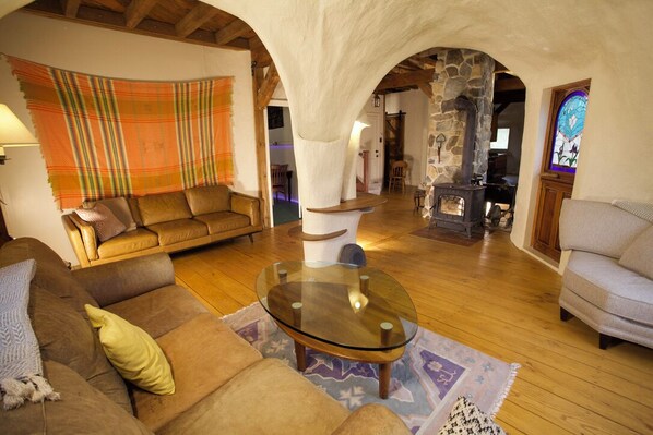 This home was handmade by artists in 1984, nestled between forest, meadow, stream, and sky. Whether it's the owls or the stars singing you to sleep, you will leave feeling rejuvenated. With swimming holes nearby, and woods to be explored just outside the front door, this secluded site is perfect for a private getaway or a group gathering.