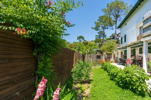 Cette location de vacances dispose d'un espace extérieur privé avec un jardin, une terrasse couverte, un balcon et un barbecue.