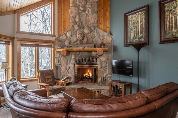 Step inside this stunning 2-story condo, with an open concept floor plan boasting natural colors and textures reflecting the world outside, and floor-to-ceiling windows capture the Gallatin Range views. Seamless flow between the living, dining, and kitchen areas makes conversing between the main floor spaces easy. A well-lit living area with vaulted ceilings beckons guests to unwind and relax on the curved leather sectional. Host a family movie night with the wall-mounted TV or warm up next to the 2-story river rock fireplace as the flames flicker and dance. Gather with family and friends around the 6-person dining table while kids sit at the 4-chair breakfast bar for a quick bite. The gourmet kitchen, adorned with granite countertops and a tile backsplash, provides everything necessary for a large home-cooked meal, including updated, high-end appliances. The shared bathroom on this floor contains a washer and dryer for added convenience. Accommodations include 2 guest bedrooms with TVs—one with a plush queen bed and access to the hot tub deck and another with 2 twin beds ideal for kids or young adults. Sliding glass door leads outside to the private deck, where guests can soak in mountain views from the 4-person hot tub or dine alfresco on warm days.