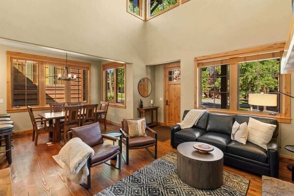 Step into a spacious open floor plan, perfect for both relaxation and entertaining. The living area is centered around a cozy gas fireplace, creating a warm, inviting atmosphere—ideal for snowy winter nights. With plenty of room for gatherings, the seamless flow to the dining and kitchen areas makes hosting easy. Upstairs, an additional common space offers a cozy couch and TV, providing a perfect spot for lounging or unwinding after a day of outdoor adventure.