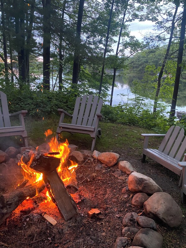 Large fire pit with 8 adult & 3 kid adirondack seating & all the firewood you would need.