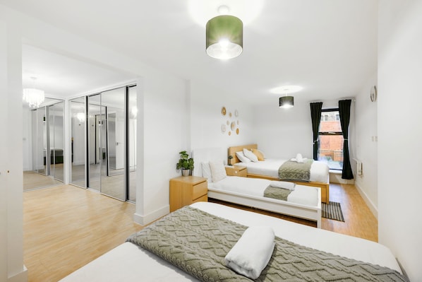 Sleeping arrangements include high-quality memory foam mattresses across all beds: • Bedroom 1: 1 Super King bed + 1 Single bed • Bedroom 2: 2 Double beds + 1 Single bed