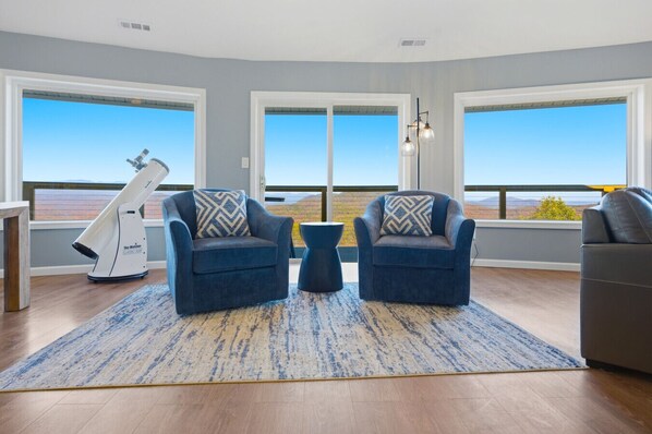 I am not sure where to begin but from the moment we passed through the gate and saw the view, we knew found the perfect vacation home. The photos in this listing don't do the view justice ... there is row upon row of mountains in every direction. Absolutely Stunning. The house is almost as incredible as the view. The owners did an amazing job with the flow and decor, and offered every amenity you can think of. We enjoyed the hot tub, the putting green, the fire pit, the pool table, the shuffle board and the outdoor seating. The only thing we did not use was the indoor fireplace, as we chose to enjoy the beautiful summer temps in the mountains with the outdoor fire pit instead. The main level was where we spend most of our time, as it was so calming and relaxing to share this view with family. The kitchen is designed to be separate but also part of the dining area - sounds strange I know but the flow of the kitchen and dining was nice. You can move furniture around a little (we did so all 6 adults could face and chat with each other). We made sure to put everything back like we found it. All the beds and bedding were SO comfortable. Easy thermostat/modern fans made managing temps easy. The owners, specifically Manny, were great to work with and an excellent communicator. We had questions about the area that he promptly answered and is an excellent host. I want to write more but have limited room left. It is a drive through and up mountain roads. We LOVED this home.