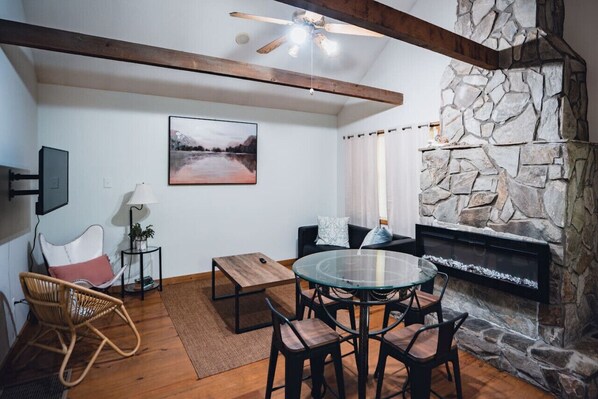 A comfy and inviting living area equipped with all the basic amenities that you will need for a comfortable stay at this cabin surrounded with nature & peace.