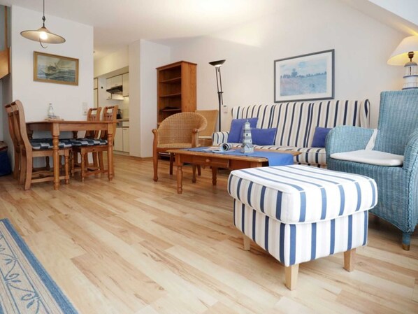 Avec des meubles de bon goût et de bons équipements, l'hébergement de vacances non-fumeur -Papillon 16/6? Sur une superficie de 65 m², qui s'étend sur deux niveaux, vous pouvez passer jusqu'à 6 personnes pour des vacances réussies au bord de la mer Baltique. En quelques minutes, vous êtes sur la plage de sable fin. Le salon / salle à manger lumineux avec sol stratifié comprend un canapé confortable, deux fauteuils, une table à manger, une t��lévision avec lecteur DVD, une connexion Wi-Fi gratuite, une chaîne hi-fi et un buffet. Depuis le salon, vous atteignez le balcon correspondant. La cuisine ouverte est entièrement équipée avec lave-vaisselle, 4 plaques de cuisson, four, hotte aspirante. Au niveau inférieur se trouve une chambre avec deux lits simples et une armoire. Chaise haute et lit bébé sont disponibles si nécessaire. Au niveau supérieur se trouvent deux chambres avec chacune un lit double et une armoire. L'appartement dispose d'une salle de douche. Machine à laver et sèche-linge sont disponibles moyennant un supplément dans la cave de la maison. Vous pouvez garer votre voiture gratuitement à la maison. Veuillez noter que les animaux domestiques ne sont pas autorisés. Les familles se sentent très à l'aise dans l'usine Papillon. Les magasins sont accessibles à environ 400 mètres.