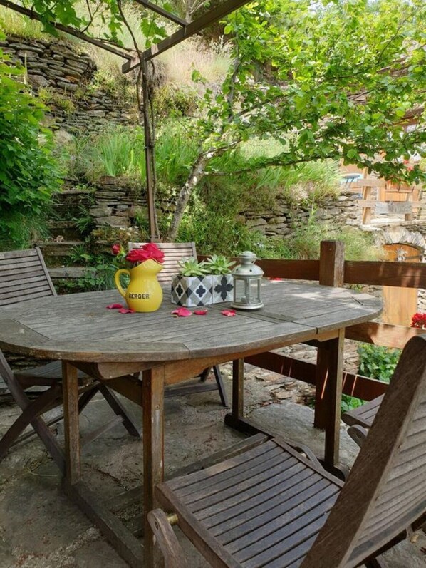 Si vous louez les deux maisons vous pouvez vous retrouver pour manger à l'intérieur de l'une ou l'autre ou sur leurs terrasses respectives si arrivée tardive