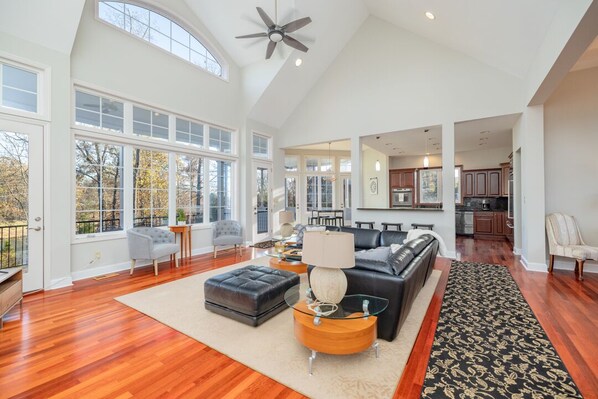 The house is large and well kept. The main living spaces are open with very high ceilings so they can get loud with a big group, but you can still find a quiet room or outdoor space. Bedrooms are large and all but one have an attached bath. The dock/boathouse was great for our boat and kayaks, well protected from boat wakes, wind, and current. Maintenance issues were handled quickly. Only negative is that the house is pretty far back in the cove so the water is shallow for swimming (no diving!) and the bottom is mucky. But it's a short kayak or boat ride to a lot of nice places to anchor or tie up and swim. We enjoyed our stay and would definitely stay here again if we have a similarly large group.