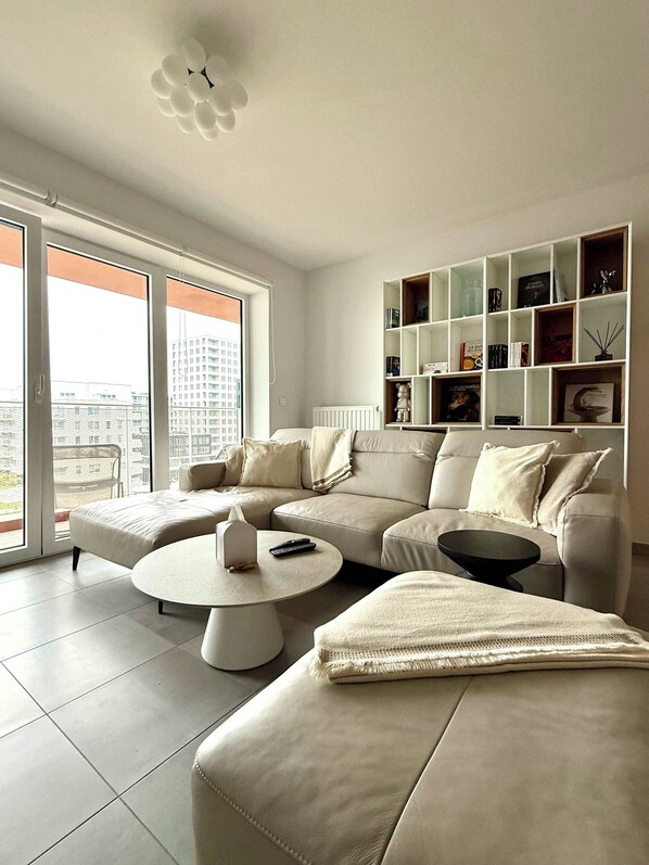 Salon spacieux avec canapé, TV et bibliothèque
