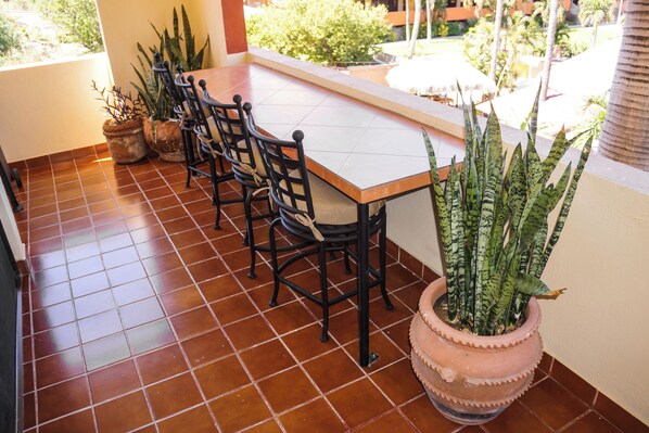 This beautiful remodeled 3-bedroom 1737 square foot condo, located in the heart of Cabo San Lucas, one block from the famous Medano beach, and only a five-minute walk to the center of Cabo and the Marina, can sleep 6 guests, having 3 bedrooms (a King in the master bedroom, a Queen in the second bedroom and a Queen and Twin in the third bedroom), there are 2 well-appointed full bathrooms with Hair Dryers. The kitchen is equipped to meet all your cooking needs. Eat at the large dining table which seats 6 or Bar-B-Que on the spacious patio which has a beautiful view of the courtyard and pool or dine at the ‘Tres Amigas Cantina’ poolside Restaurant and Bar, where they serve Breakfast, Lunch and Dinner at great prices. Quiet mini split A/C's and ceiling fans in all rooms will keep you cool during the warm summer evenings. For your entertainment pleasure, there is a Large Flat Screen TV in the living room and Flat Screen TV's in the master bedroom and the second bedroom. To keep you in touch with the rest of the world this condo has its own dedicated Fiber Optic Internet service (60 Mbps) plus phone service with free Local & International calling.