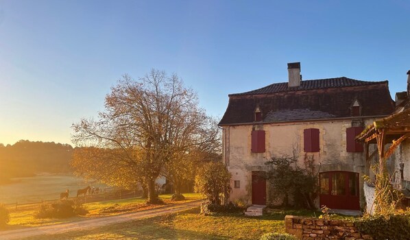 Gîte de charme dans le Périgord, pour 6 personnes de 120 m2 sur 2 étages avec cuisine totalement équipée , buanderie, grand salon, 3 chambres (6 couchages ) , salle de bain et WC séparés. Terrasse équipée ( auvent, parasol et mobilier d'extérieur) . Accès à aire de jeux pour enfants, ping pong et boulodrome. Accès à piscine partagée avec un autre gîte et les propriétaire selon horaires (10h30 à 12h30 et 16h30 à 18h30). Gîte non recommandé aux personnes à mobilité réduite. Chiens non admis. Pas de fêtes. Gîte non fumeur. Réservations en juillet et aout du samedi au samedi exclusivement. Ménage inclus. Forfait draps et serviette toilette 50 euros
