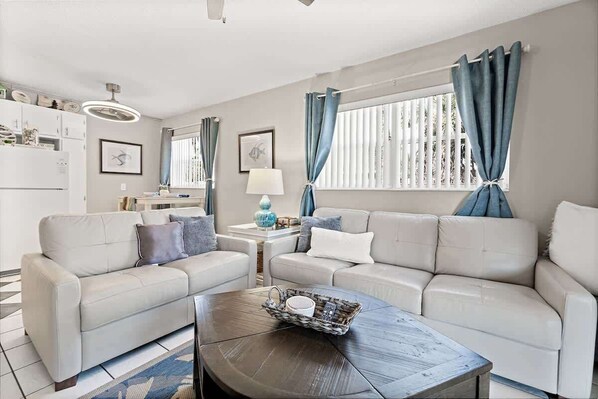 This small condo complex offers a friendly and private feel. After a day of adventures or relaxing in the Florida sun come back to this inviting space where every inch is designed for comfort and style. Your perfect beachside escape awaits! 🌴✨This sun filled living room welcomes you. Unwind on the comfortable sofas while streaming your favorite shows.