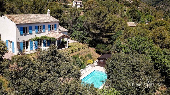 Maison récente de type "Mas provençal" avec piscine située sur les hauteurs de Caunes Minervois dans un environnement méditerranéen au cœur de 2 000 m2 de chênes et de pins.