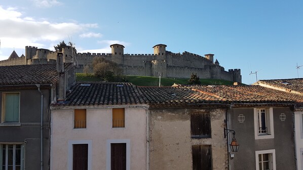 L' appartement possède;1 salle de bain, un WC séparé , une cuisine équipe( frigo, congélateur,lave vaiselle, plaque, four etc) salon avec télé , 2 chambre avec lits double, une terrasse avec une table bistrot avec vue sur les remparts de la cité de Carcassonne. Possibilité de loger 6 personnes avec le canapé lit avec supplément( 20€ par j/et par personne) ainsi qu'un lit bébé peut être proposé avec supplément (10€ par j).