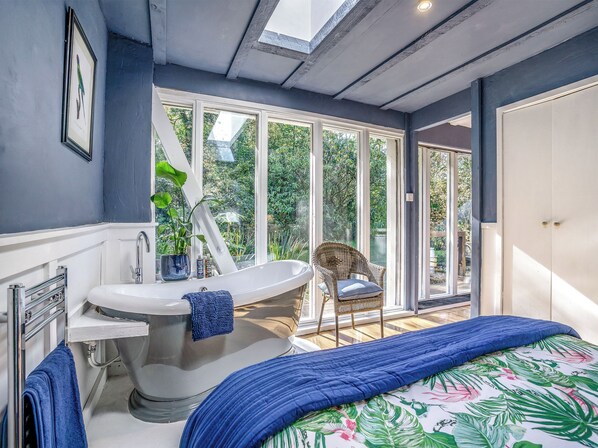 Entering the property you’ll find an open plan living-kitchen space with a view straight through to the gorgeous garden. Inside, the space is all on one level and boasts a well-equipped kitchen, a cosy sitting area with wood burner, and a dining space. Beyond the living area is a spacious double bedroom with a roll top bath and views over the private garden, plus an en-suite shower room. The eco-friendly structure is grass covered, helping retain heat absorbed throughout the day, and the glass side overlooking the garden faces south capturing the sun. To top it up, the property benefits from a wood burner and electric radiators powered partially by the hydroelectric plant on site.
