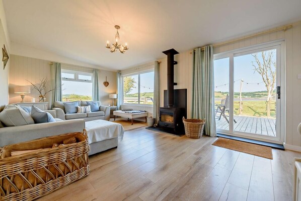 An unmade track leads to the holiday home. Once inside, discover a light and airy, single-storey lodge, with contemporary decor and spacious living areas. The hub of the home is a large lounge, with dual-aspect windows looking out across the estuary. Chill out here, after a long walk, stretched out on the comfortable sofas with your favourite book. On chilly evenings, fire up the wood burner for a cosy movie night in front of the TV/DVD. This room opens into an elegant dining area, where you can enjoy evenings of great food and laughter together. A separate kitchen has everything you need for a self-catering break. The property has three beautiful bedrooms, all decorated in a delicate nautical theme. Outside, relax on the decked area overlooking the water, watching the local wildlife and taking in your tranquil surroundings.