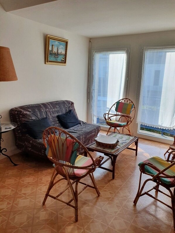 Grande salle plein sud (salon, salle à manger avec un coin cuisine) avec 2 portes-fenêtres et un petit balcon avec vue sur le jardin arboré et bordé de bambous, 3 chambres dont 2 à l'arrière