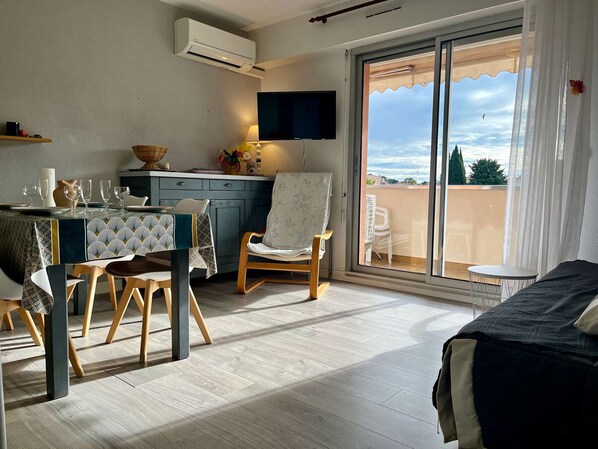 Appartement climatisé, 2 pièces avec terrasse, parking privé, proche plage et commerces