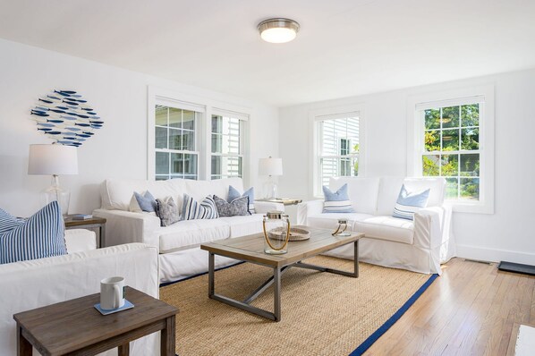 The living room is decorated in crisp shades of white, quiet blues and a touch of the hues of sand. Want to lounge around? - take your pick of a couch, love seat and comfy chair. The white-washed fireplace is the showcase of this room with a large flat screen TV mounted above. The home is equipped with SmartTVs that will allow you to stream all of your favorite programs so be sure to bring your passwords. Local channels (including NESN for Red Sox Games) are provided to guests through FuboTV.