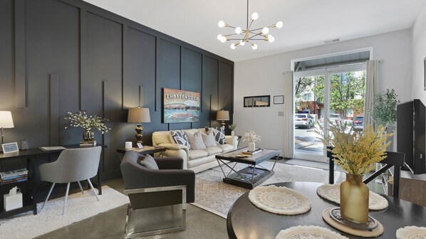 Comfort & Living • Plush king bed with premium linens + sound machine and ample closet storage space • Smart TVs with popular streaming apps in living room & bedroom. • Fast 300+ Mbps WiFi + dedicated workspace