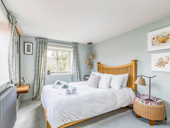 The first bedroom at the top of the stairs is a charming double bedroom, with dual aspect windows overlooking the beautiful garden and with views out over the neighbouring fields. It has ample storage in the wardrobe over the chest of drawers and a large mirror.