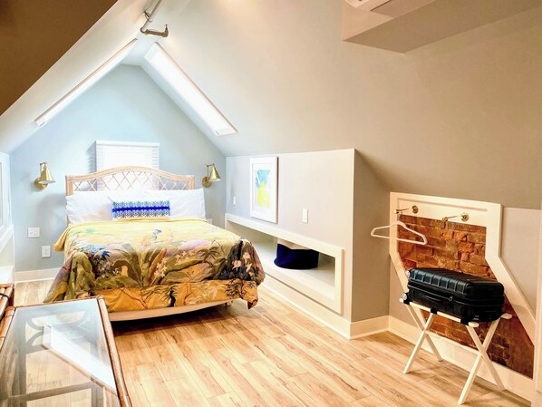 July and August price drop! Welcome to The Dygert House and its panoramic Channel View Residence. As you cross the marble landing, you are transported to a private space offering an unparalleled experience in the Village of Clayton. With a stunning panorama view of the Village and St. Lawrence River, you are suddenly eye-level with church steeples enjoying the River breeze from your balcony or one of the multiple Velux sky windows that illuminate the attic-turned-architectural feature space. Enjoy happy hour on your private balcony, then be your best chef in the fully appointed kitchen, anchored by a stunning island with seating for six. After dining among the tree-tops, sink into custom appointed vintage rattan seating and enjoy a movie on your 50” smart TV. Upon retirement to your queen bed you can view the stars while wrapped in luxury linens. The Channel View residence is ideal for hosting dinner parties, game night or winding down in this tree-top sanctuary.