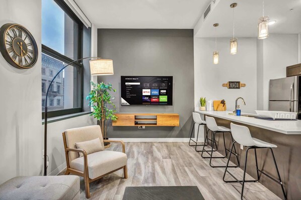 You will immediately be welcomed by the open light-filled space. With the comfy sofa, modern decor, coffee table to set drinks and snacks on, and a smart TV, this living room will be your perfect spot to unwind after a day of exploring all Cleveland has to offer.