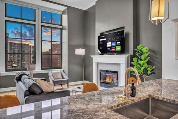 The living room is perfect for enjoying memorable moments after a day in the city. Relax on the sofa, stream your favorite shows, or simply enjoy the elegant setting.