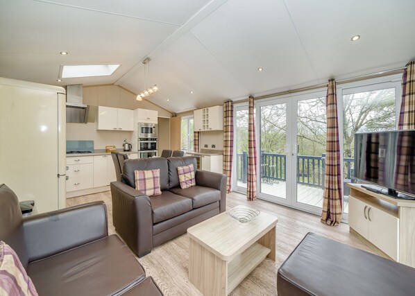 Step into the epitome of style with our holiday home, a perfect retreat for family and friends in a breakaway haven. Revel in the inviting open-plan living space, adorned with a spacious Flatscreen TV, plush sofas, a modern kitchen, and a contemporary dining area, creating the perfect backdrop for shared moments. The double bedroom boasts a generously sized en suite bathroom, complemented by a spacious twin room (Twin beds are 2ft 6) and a family bathroom. Open the French doors to a captivating outdoor decking area, ideal for watching the sun set in the company of your loved ones.