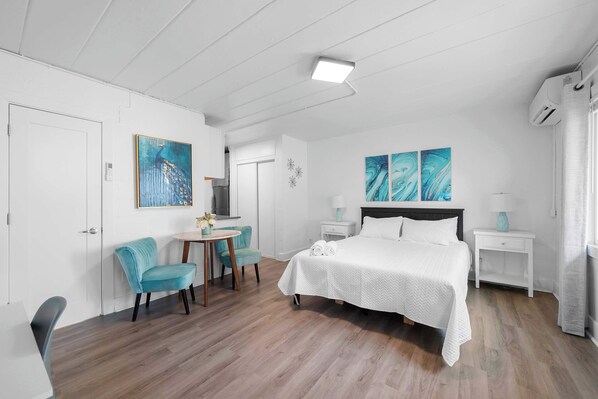 This home comfortably sleeps 2 guests in a luxurious queen size bed fitted with soft blankets and crisp linens for a great night’s sleep. The full bathroom includes a single vanity and walk-in shower.