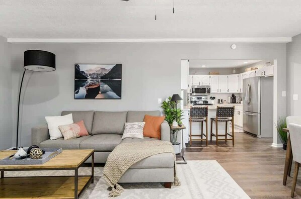 The open-concept living space features a cozy lounge with a 60" TV with Netflix and is perfect for family gatherings or movie nights.