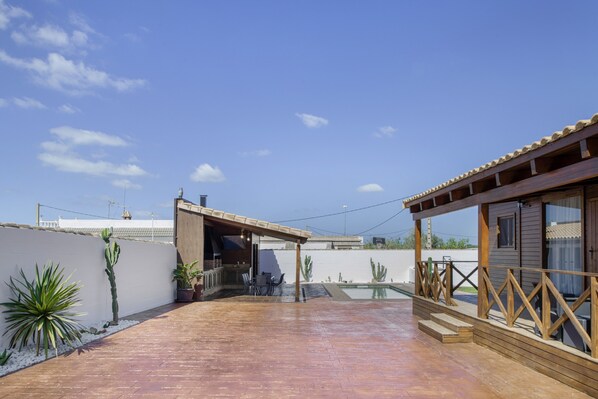 La villa Fatema, de plain-pied, est située à Conil de la Frontera. Cette propriété de 70 m² comprend un salon, une cuisine, 3 chambres et 2 salles de bain, pouvant accueillir jusqu'à 8 personnes. Vous profitez d'une connexion Wi-Fi haut débit adaptée aux appels vidéo, d'un espace de travail dédié pour le télétravail, d'une télévision dans le salon, d'une télévision dans la chambre principale et d'une autre dans l'espace barbecue, de la climatisation, d'un lave-linge et d'un sèche-linge. Une chaise haute pour enfants est également à votre disposition. Cette location de vacances offre une piscine privée, une aire de jeux, un jardin, une terrasse découverte, une terrasse couverte et un espace barbecue.