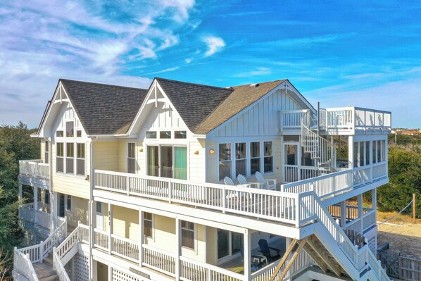 See why guests choose Ricky's Retreat Too year after year for their OBX vacation. This oceanside home is located in the Ocean Sands community of Corolla. Gather your beloved family members and favorite friends in anticipation of securing this spectacular home with exclusive amenities such as a home theater, a private heated pool, and seven custom en suites, 9 bedrooms total. Since this home is only approximately 362 feet from your driveway to the beach access walkway, you will enjoy ocean views from the mid and top levels of this beautiful home.
