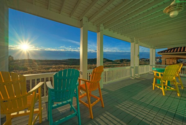 The view of Port Aransas Beach from the property was beautiful! We saw clear skies with plenty of sun and a full moon at night with coyotes howling in the dunes beside us during my birthday vacation. My family and friends had a wonderful time as well. The neighborhood is so quiet at night, relaxing, and clean. We will definitely return. The beach house was well equipped and had everything we needed. The elevator came in handy a lot! Such a beautiful property.