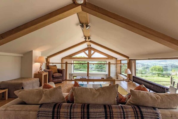 This light filled, spacious barn spreads over three levels. The lower ground floor with underfloor heating, is home to a large sitting room / dining room with sliding doors that open out on to the patio. In the lounge, big comfortable sofas gather around a log burning stove - perfect for cosy evenings, there is also a television and a dining table that seats 8. This room is lined with floor to ceiling windows on two sides, giving the opportunity to enjoy the amazing views across the countryside.