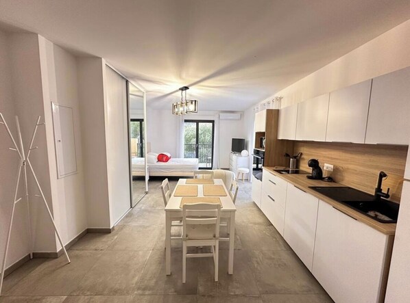 * Superficie de 33 m² fonctionnel, bien agencé et lumineux * Cuisine entièrement équipée : plaques à induction, hotte, four, réfrigérateur, lave-vaisselle, micro-ondes, machine à café, ustensiles de cuisine, aspirateur * Coin nuit : lit 140 cm, tête de lit, meubles de rangements, TV, grand placard avec miroir * Salle d'eau moderne: douche à l'italienne, WC suspendu, sèche-serviettes, lave-linge * Climatisation réversible pour un confort * Salle d'eau moderne: douche à l'italienne, WC suspendu, sèche-serviettes, lave-linge * Climatisation réversible pour un confort optimal été comme hiver * Terrasse avec mobilier * Place de parking incluse Équipements haut de gamme : * Climatisation réversible * Double vitrage et volets roulants électriques * Chauffe-eau thermodynamiquel