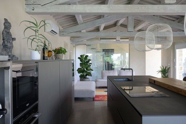 espace ouvert: deux canapés, fauteuil, cheminée, table à manger (personnes: 8), internet WIFI, climatisation, télévision, cuisinière, congélateur, cuisine bien équipée, four micro-onde, four, grille-pain, machine à café italienne, machine à café américaine, sortie sur le balcon, sortie sur le jardin, sortie sur le patio, sortie sur la terrasse.