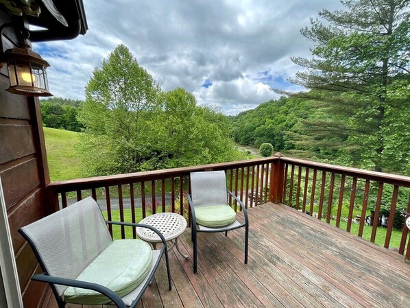 La véranda séparée offre une autre cheminée à gaz, des sièges confortables et un canapé-lit queen-size. Également la télévision (pas de satellite) et la Wii pour vos jeux ou regarder Netflix sur votre compte. Portes françaises sur le pont ouvert avec vue sur le fleuve et la montagne.