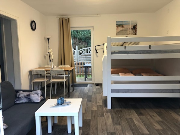 Nette, kleine Wohnung mit Mini-Veranda. Für 2-3 Personen oder junge Familien ok, mit 4 Erwachsenen ein soziales Experiment (160x200 Doppelstockbett).Parkplatz direkt vor der Wohnung, Rangierbereich aber sehr eng.Check-In und -Out verliefen sehr freundlich und schnell.Fazit: Wer sowieso den ganzen Tag unterwegs ist, ist hier gut untergebracht.