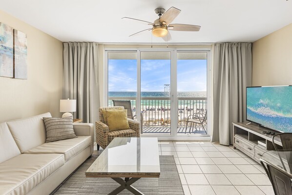 Notre condo rénové et géré en famille au 3ème étage 1 chambre 2 salle de bains 873 en 2018 est situé sur la plage avec vue directe sur l'océan de la côte du golfe depuis un balcon spacieux.