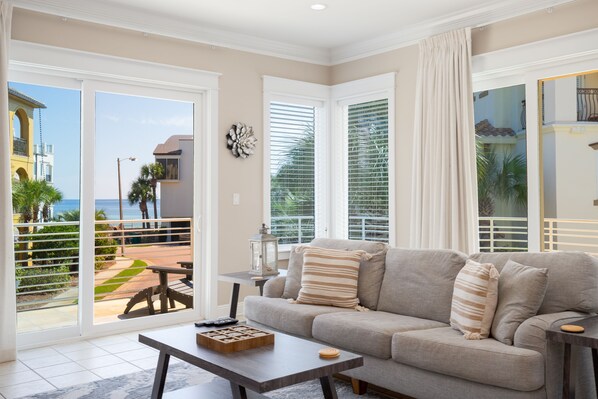 Everyone will gather on the second floor to share stories of their beach adventures. There’s ample seating in the cozy living area, complete with a flat-screen TV. The beautiful indoor fireplace is meant for visual enjoyment only and is not intended for guest use. The kitchen is designed so that no one will miss out on any of the conversations, and the dining area includes a formal seating area along with breakfast bar space. The balcony also provides a beautiful area for alfresco dining just off the living room. The kitchen is well appointed with all the comforts of home and is large enough for several to engage in meal prep. Plus, the pool area has a grill, so cook-outs are a definite possibility. A beverage bar is located on the staircase landing. And the carefully designed placement of windows brings in lots of natural light and provides breath-taking views in all directions. Several private balconies enable guests visions of exquisite sunrises and colorfully emblazoned sunsets to enjoy.